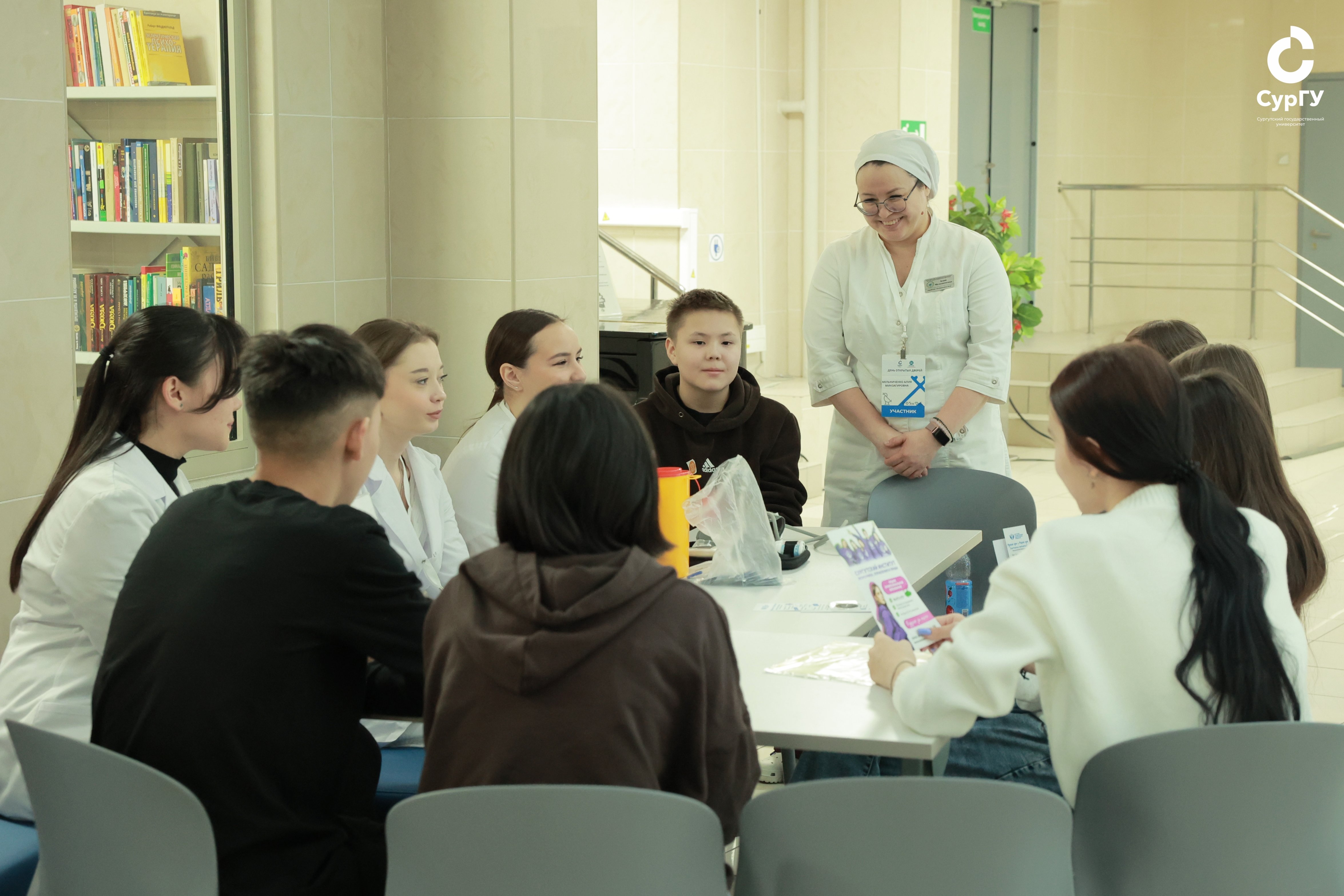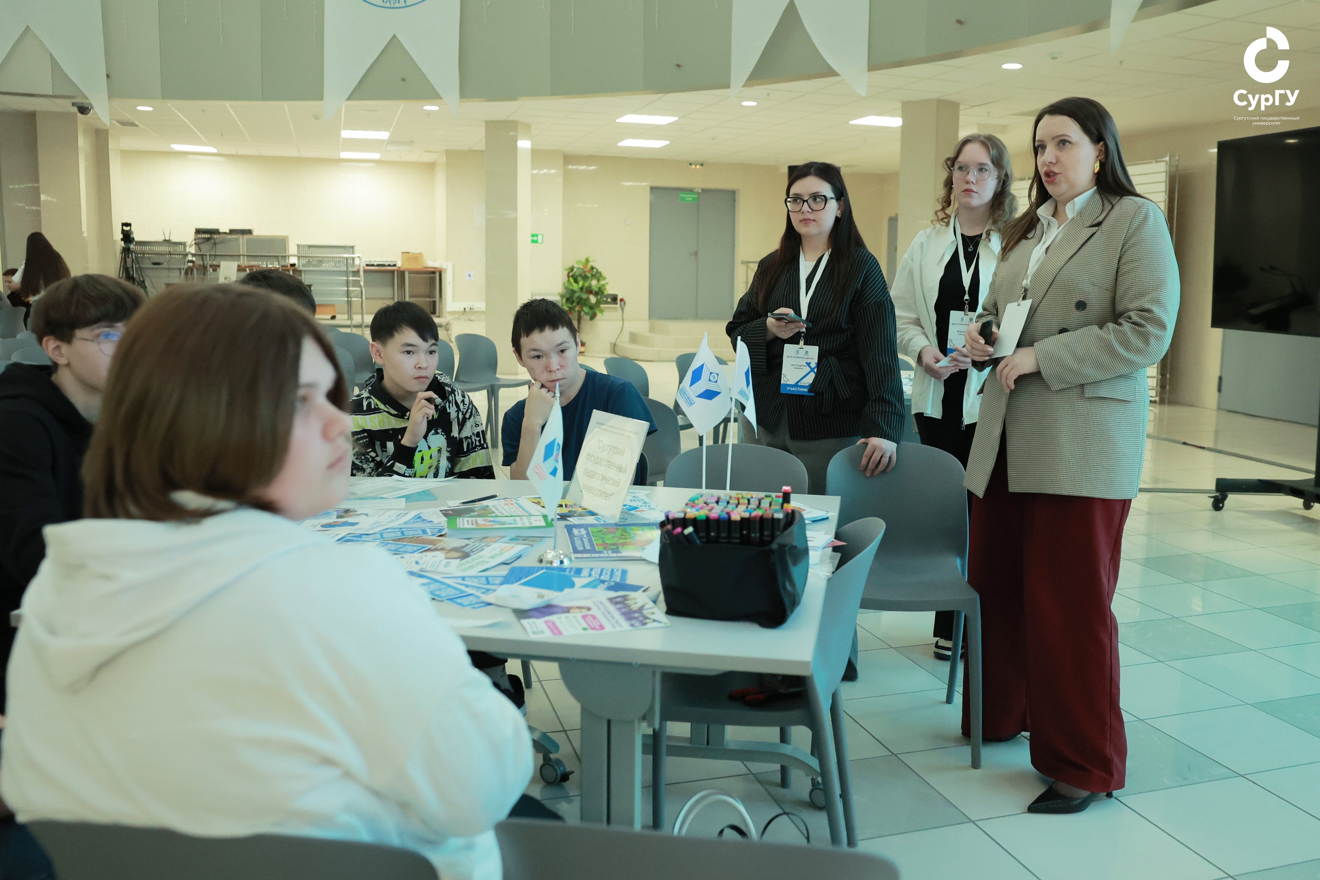 На мероприятии были организованы площадки организаций высшего и среднего профессионального образования. Сургутский государственный университет был представлен Институтом среднего медицинского образования, кафедрой теории физической культуры и кафедрой медико-биологических основ физической культуры. Своя площадка была также у ИПО КНЮ, подготовленная совместно с кафедрой лингвистики и переводоведения СурГУ. Другие площадки подготовили Сургутский государственный педагогический университет, а также две крупнейших в городе организации СПО – Сургутский политехнический колледж и Сургутский институт экономики, управления и права. Всего, по словам директора ИПО КНЮ, кандидата педагогических наук, доцента кафедры педагогики профессионального и дополнительного образования Ольги Муллер, День открытых дверей собрал около полсотни ребят.