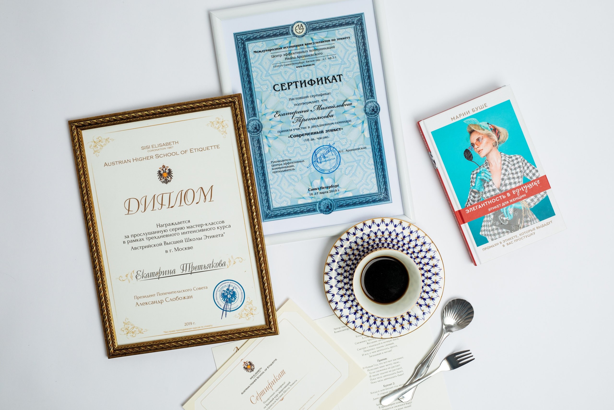 Екатерина Третьякова — сертифицированный тьютор по вопросам этикета и сервировки. Будучи ранее специалистом департамента культуры, молодежной политики и спорта она с удовольствием познавала азы протокола, получив основы речевого этикета. А в декретном отпуске усовершенствовала свои навыки, пройдя обучение у гуру Москвы и Санкт-Петербурга Ивана Арцишевского, Анны Валл и Мартена Боггартса. Училась параллельно и в Австрийской высшей школе этикета, а совсем недавно получила сертификат от Жаклин Кено (Франция) по искусству сервировки.