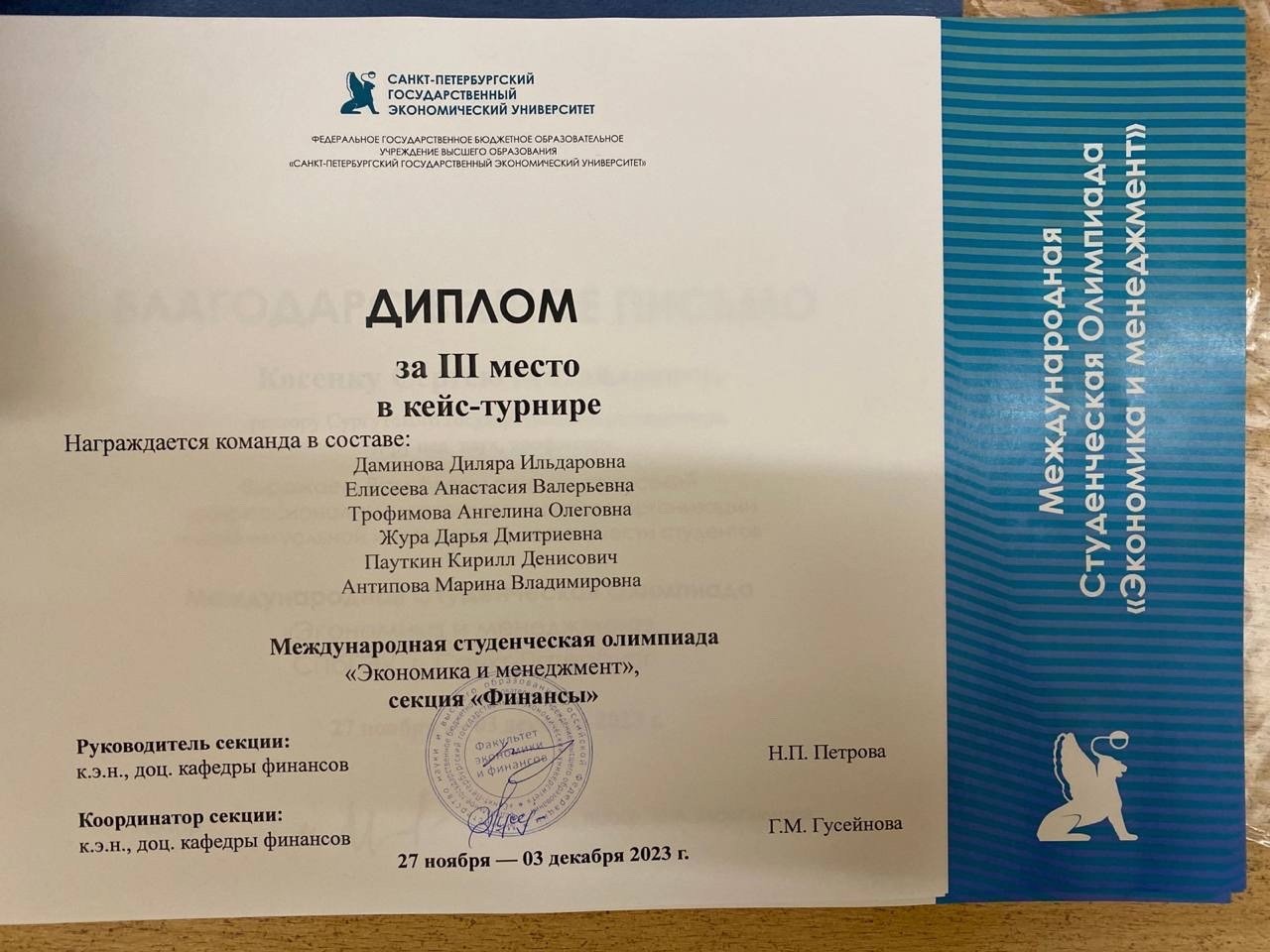 «На кейс-турнире были задания, связанные со страхованием, налогообложением, а также финансами и корпоративными финансами. Первый тур состоял из тестирования по 30 вопросам. А во втором туре был кейс на инициативное бюджетирование. Нашей командой было выдвинуто предложение по созданию крытого скейтпарка в городе Томске. И заняли третье место. Было очень интересно участвовать. Спасибо Оксане Николаевне за возможность участвовать в международной студенческой олимпиаде и отстаивать честь родного СурГУ на престижном конкурсе в Санкт-Петербурге», – прокомментировала второкурсница направления «экономика» Диляра Даминова.