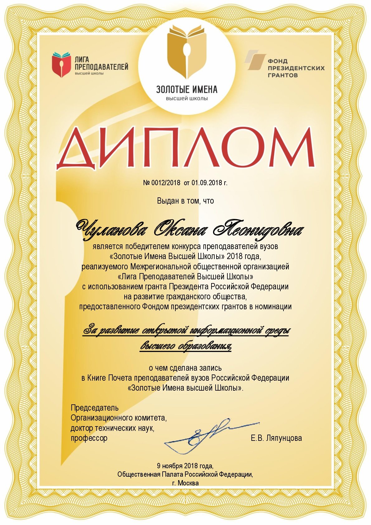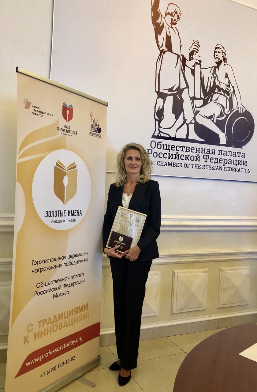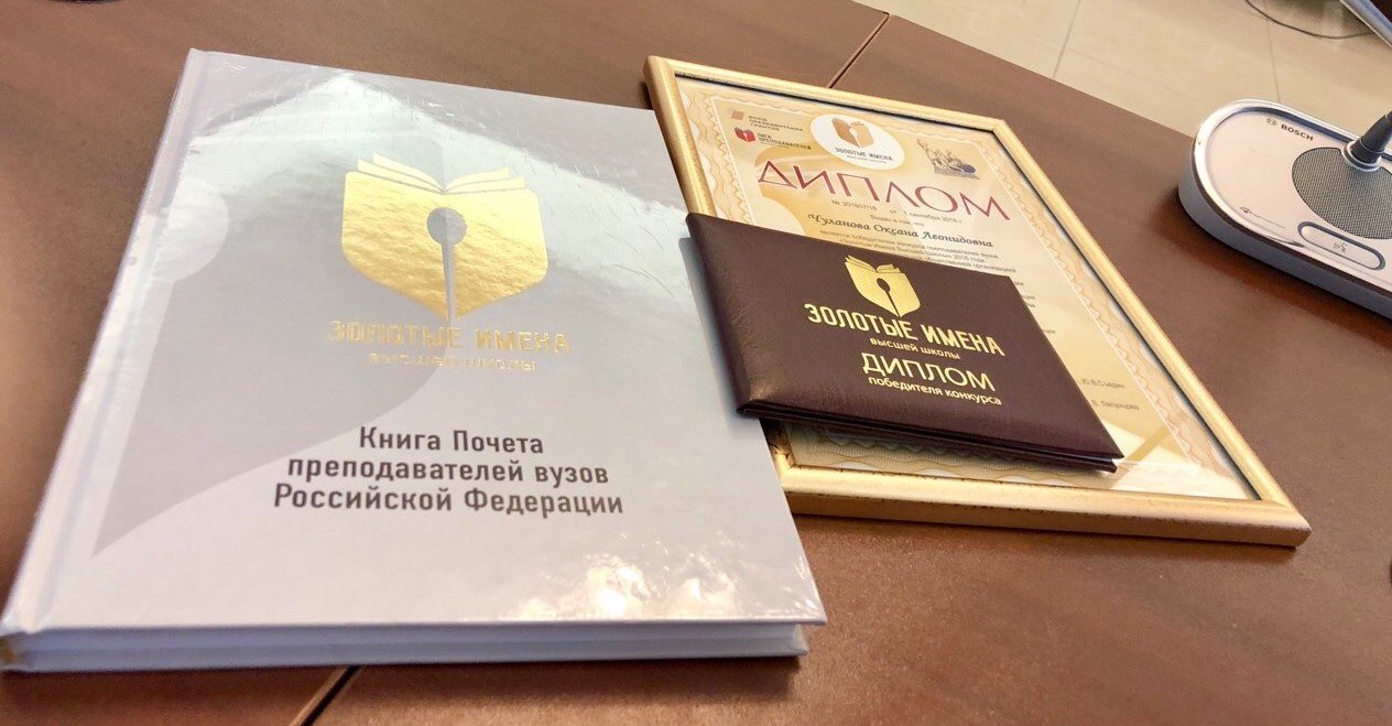 09 ноября 2018 г. в Общественной палате России состоялась торжественная церемония награждения победителей конкурса преподавателей вузов «Золотые Имена Высшей Школы», где Оксана Чуланова, доктор экономических наук, доцент, профессор кафедры «Государственное и муниципальное управление и управление персоналом» СурГУ, стала победителем в номинации «За развитие открытой информационной среды высшего образования».