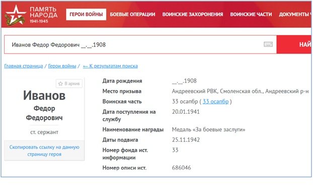 «К сожалению, у нас нет свидетельств, переписки с фронта, поэтому невозможно точно проследить судьбу солдата-сержанта Иванова Фёдора Фёдоровича вплоть до ноября 1942 года. А потому начнем с официальных документов о награждении его боевой наградой, медалью «За боевые заслуги», которой он был отмечен в самый первый день начала печально известной Ржевско-Сычёвской операции «Марс» (25.11. – 20.12.1942 г.) Западного фронта (командующий генерал-полковник И.С. Конев). Эта операция является второй попыткой отодвинуть немцев от Москвы, окружить 9-ю армию Моделя, ликвидировать Ржевский выступ. Отцу уже 34 года. Он командир саперного отделения в 141-м саперном батальоне 33-й отдельной саперной бригады в 20-й армии. Награждён за умелые и своевременные действия подразделения в бою, который начался в 9:20 утра 25 ноября, где и был легко ранен у села Жеребцово, что недалеко от старинного села Хлепень, но поле боя не покинул», – с особой грустью и в то же время с гордостью продолжает рассказ об отце ученый Сургутского госуниверситета.